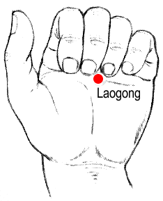Croisez les pouces et, avec le pouce droit, massez le point Laogong (situé au centre de la paume, là où l’annulaire et le majeur se rejoignent quand vous fermez le poing) .