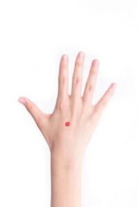 👉 Sur la main, entre le 2ᵉ et le 3ᵉ os métacarpien (ceux de l’index et du majeur), il existe un point précis.
